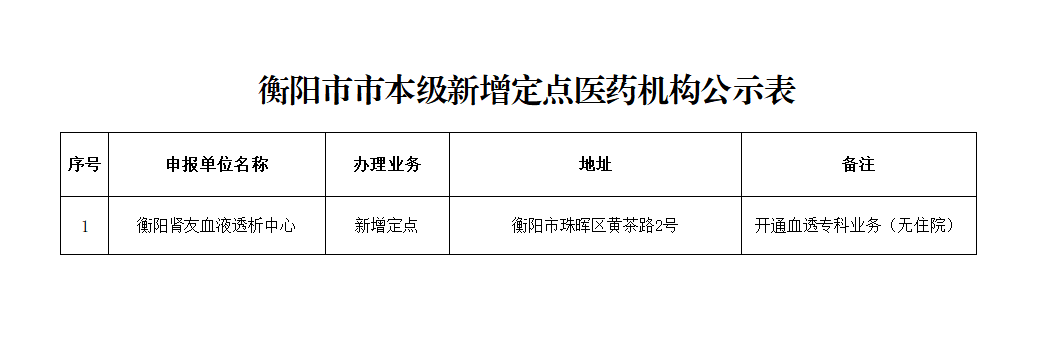 2025年12月衡阳肾友血液透析中心申请市本级医保定点业务,按照《衡阳市医疗保障事务中心基本医疗保险新增协议医药机构准入规程(暂行)》相关要求,相关工作人员进行现场评估,经评估,该医疗机构符合准入条件,拟予以开通市本级医保相关业务,特此公示。