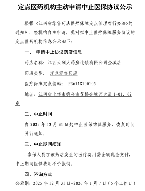 【上饶】(天酬金城店)定点零售药店主动申请中止医保协议公示