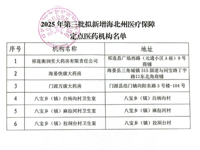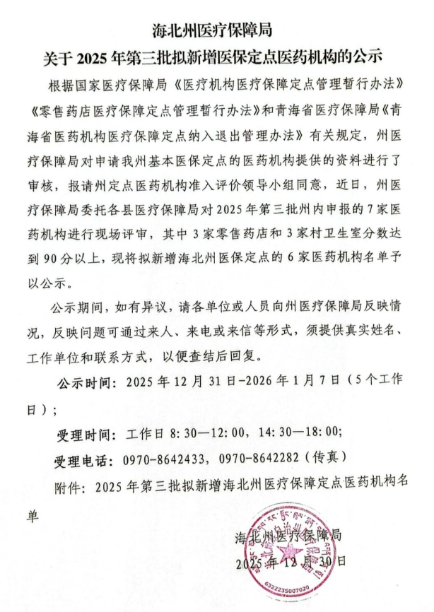 【海北】海北州医疗保障局关于2025年第三批拟新增医保定点医药机构的公示