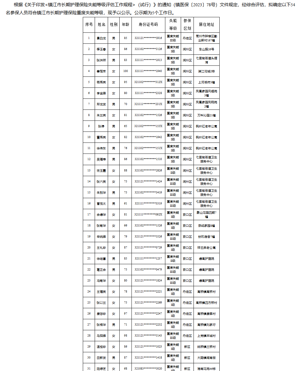【镇江】2026年度镇江市长期护理保险失能等级评估结论公示(1月第一批)