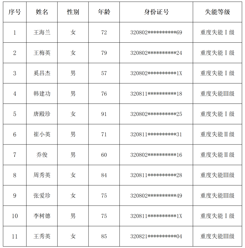 根据《市政府关于印发淮安市长期护理保险实施方案的通知》 (淮政发[2023] 2号) 、《关于印发<淮安市长期护理保险实施细则(试行)>的通知》 (淮政发[2023] 33号)、 《国家医保局办公室 民政部办公厅关于印发<长期护理失能等级评估标准(试行)的通知>(医保办发[2021]37号)》文件精神,经评估机构评估,现将市本级长期护理保险失能等级评估的结论公示如下: