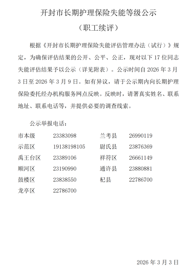【开封】开封市长期护理保险失能等级公示(职工续评)--第149批