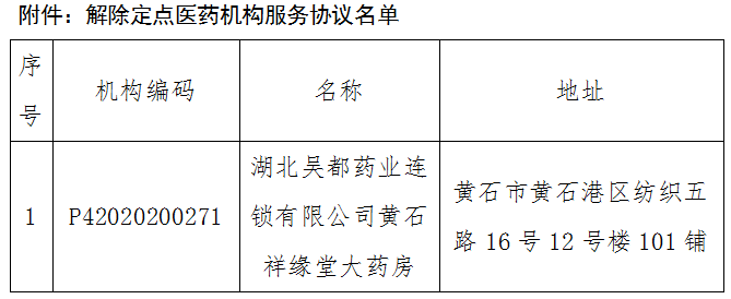 【黄石】关于解除湖北吴都药业连锁有限公司黄石祥缘堂大药房定点零售药店医保服务协议的公示
