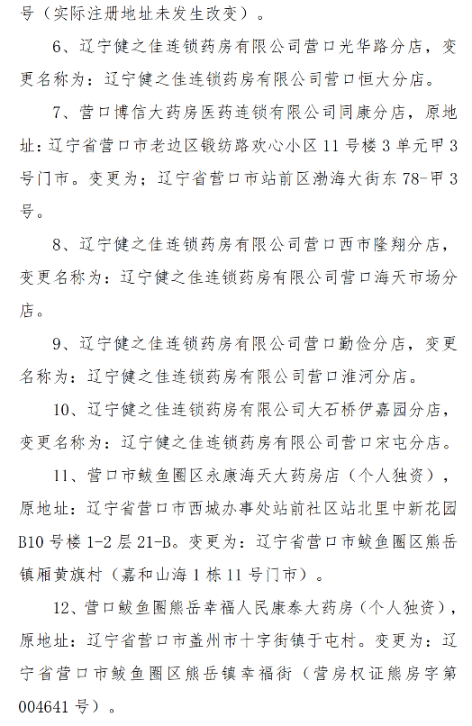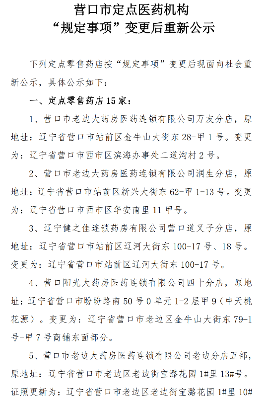 【营口】营口市定点医药机构 “规定事项”变更后重新公示