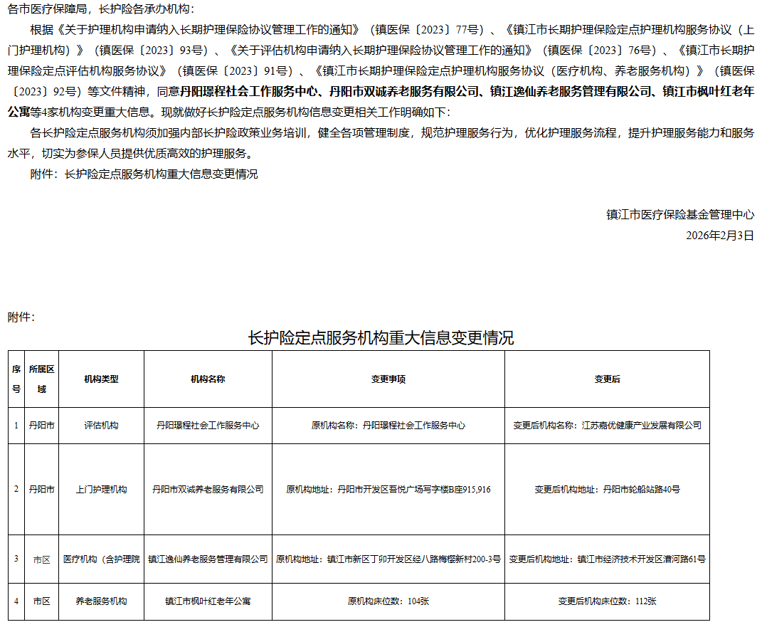 【镇江】关于镇江市长期护理保险定点服务机构信息变更的通告