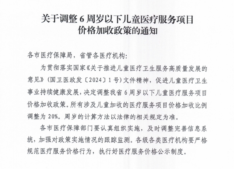 为促进儿童医疗卫生事业持续健康发展,现将省医保局《关于调整6周岁以下儿童医疗服务项目价格加收政策的通知》(辽医保〔2025〕57号)转发给你们,请按要求落实好相关工作。