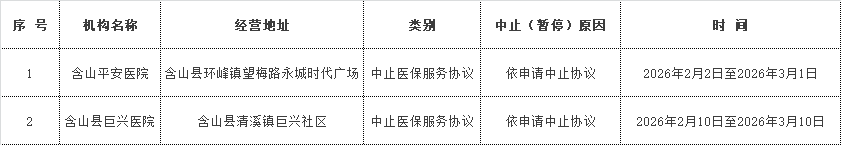 根据《医疗机构医疗保障定点管理暂行办法》(国家医疗保障局令第2号)及安徽省定点医疗机构医保服务协议相关要求,经定点医疗机构申请,下列2家医疗机构予以中止医保服务协议,现公示如下: