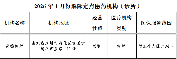 根据《医疗机构医疗保障定点管理暂行办法》(国家医疗保障局令第2号)、《零售药店医疗保障定点管理暂行办法》(国家医疗保障局令第3号)、山东省医疗保障局办公室关于于印发《山东省医药机构医疗保障协议管理经办规程(试行)》的通知(鲁医保办发〔2025〕5号)文件要求,经医药机构自主申报,确定将兴德诊所于2026年度1月份解除医保定点协议管理,现予公示。