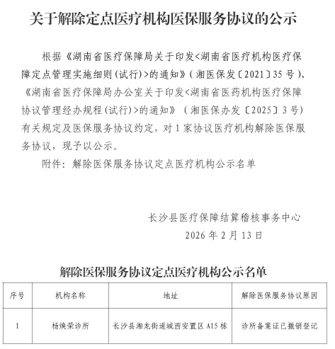 【长沙】关于解除定点医疗机构医保服务协议的公示