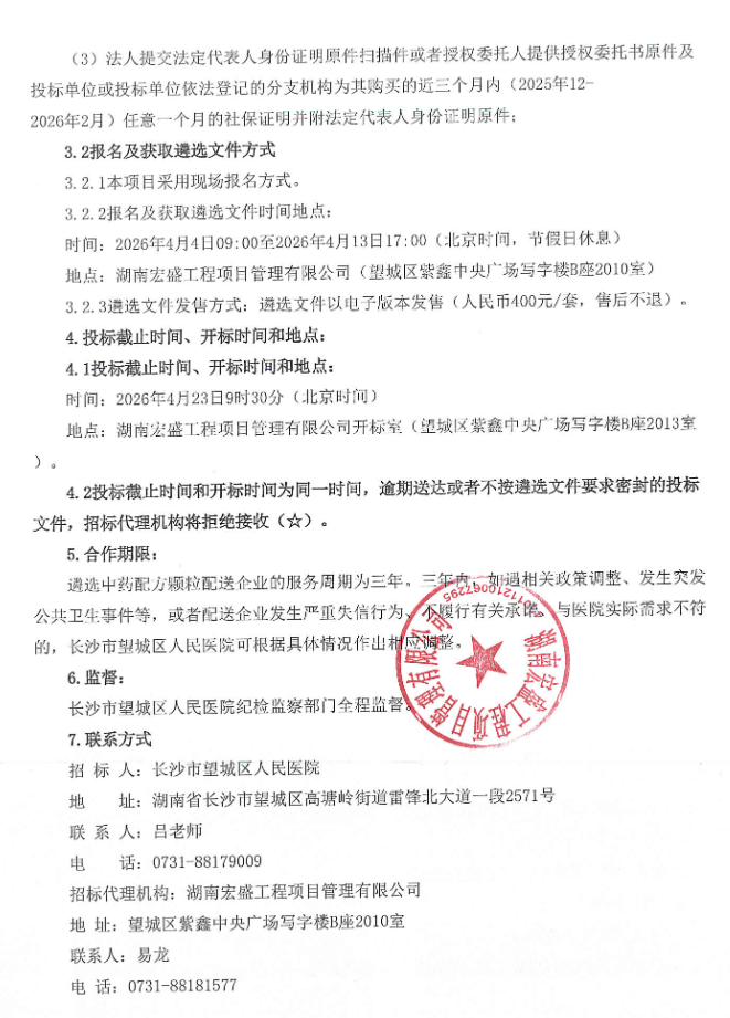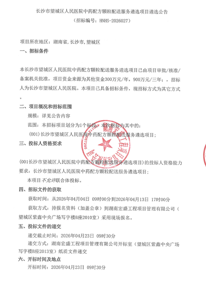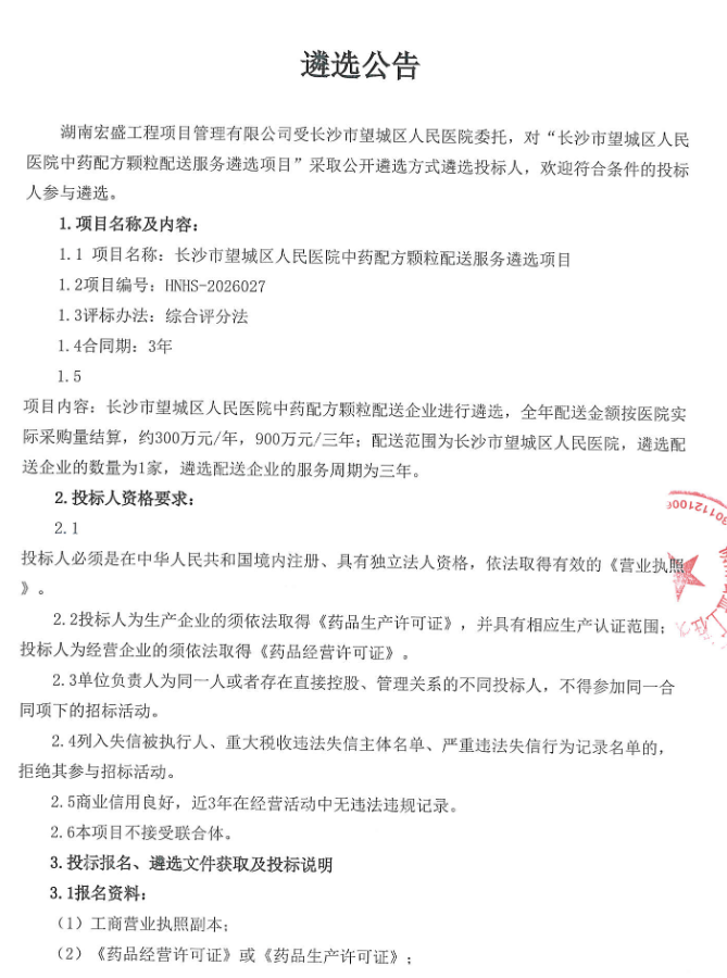 湖南省长沙市望城区人民医院中药配方颗粒配送服务遴选项目遴选公告