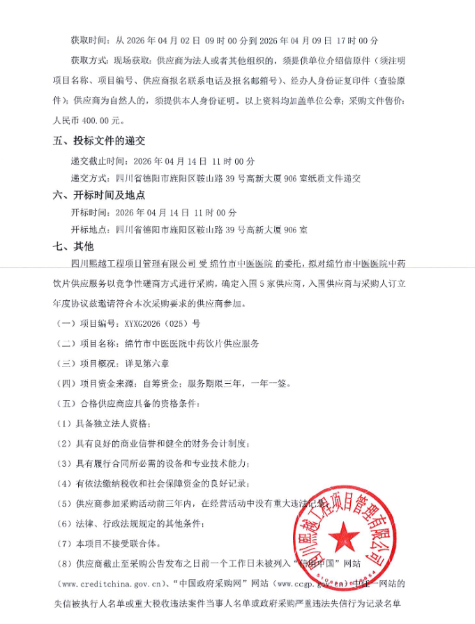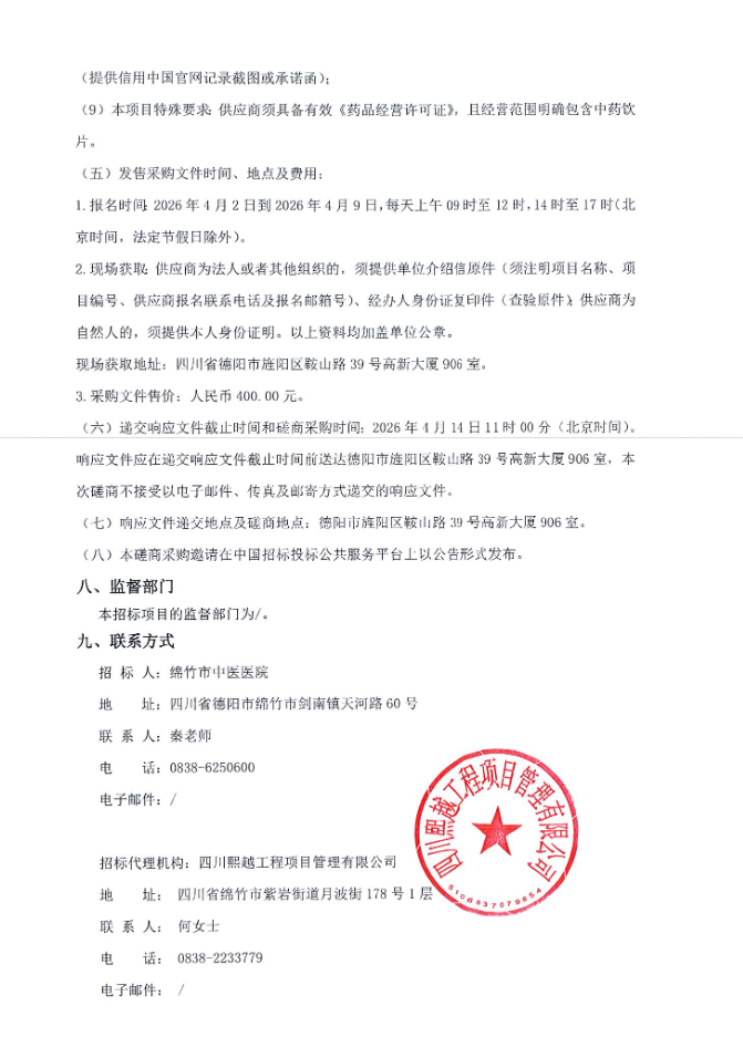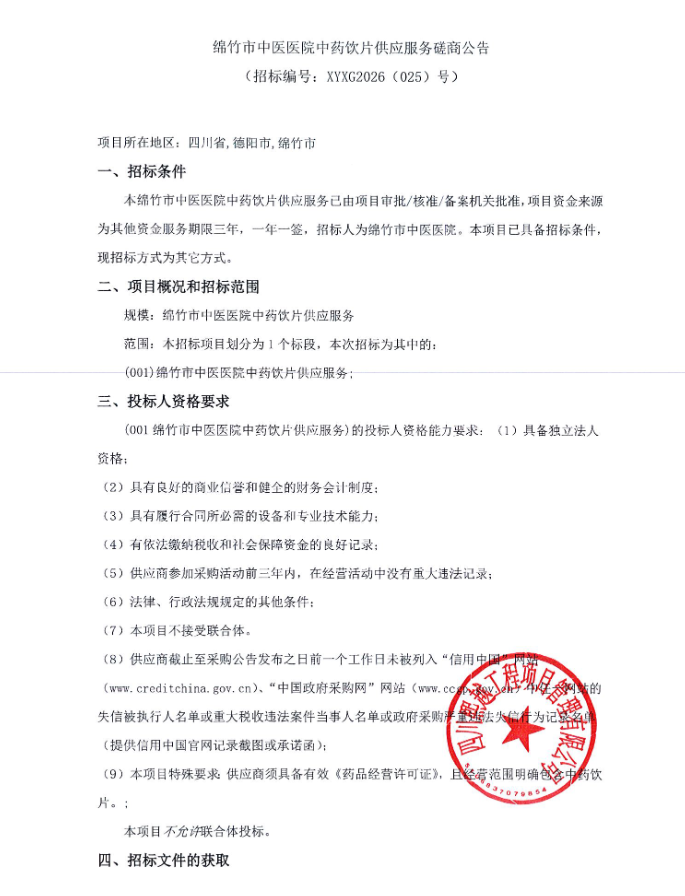 四川省绵竹市中医医院中药饮片供应服务磋商公告