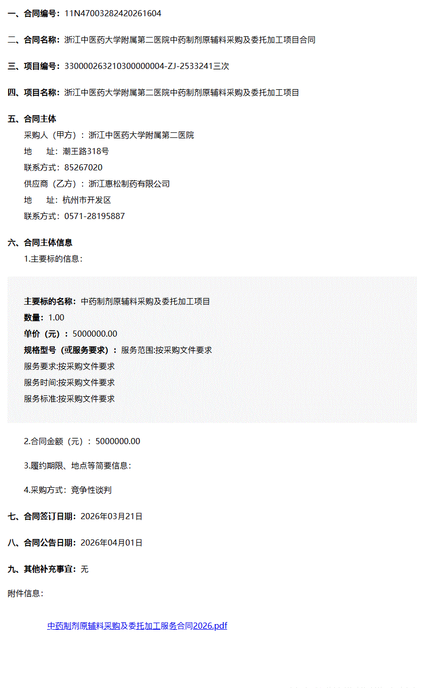 浙江中医药大学附属第二医院中药制剂原辅料采购及委托加工项目合同公告