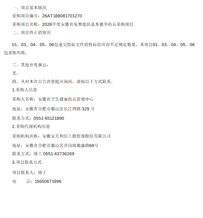 2026年度安徽省免费提供基本避孕药具采购项目01、03、04、05、06包终止公告