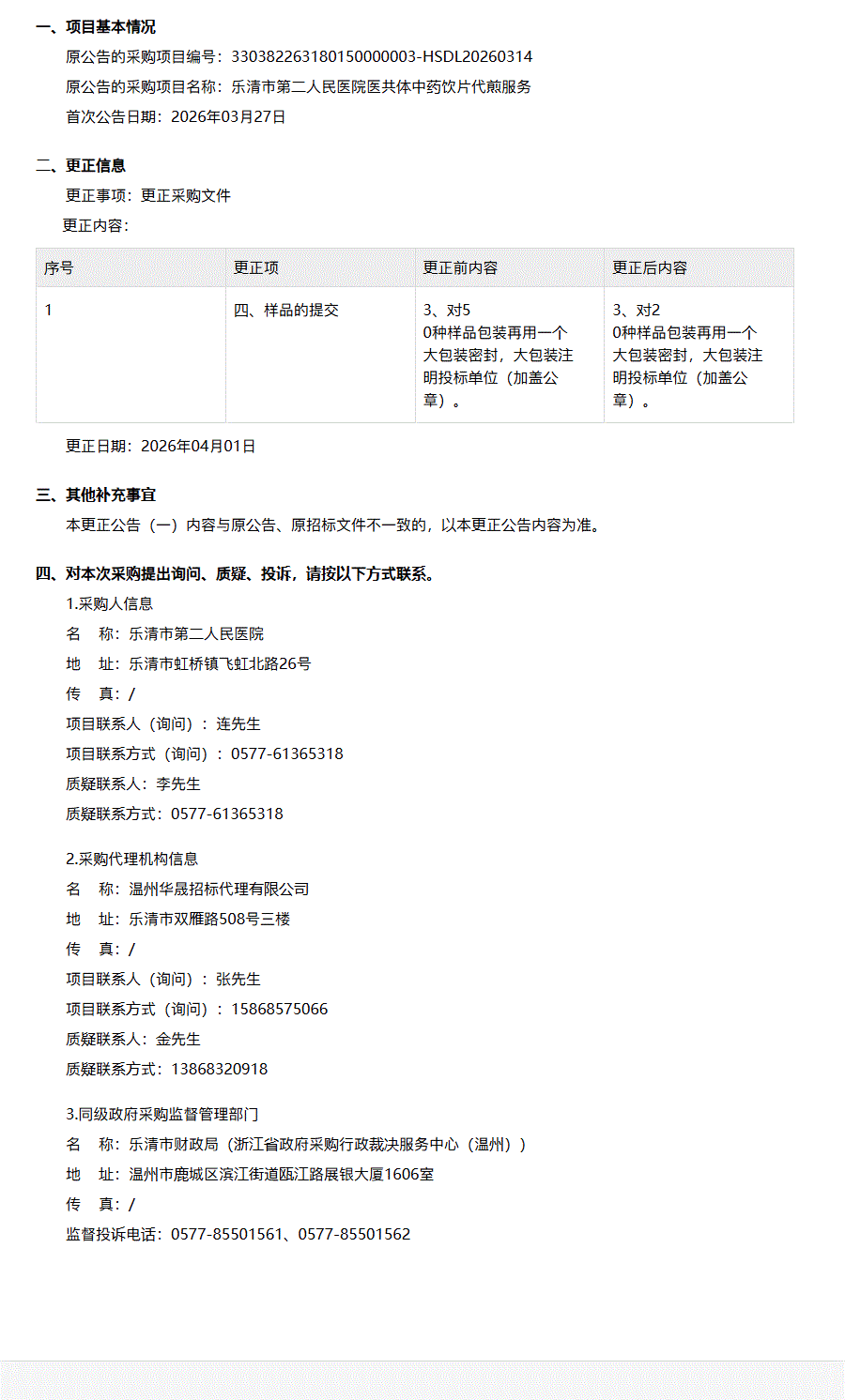 浙江省温州华晟招标代理有限公司关于乐清市第二人民医院医共体中药饮片代煎服务的更正公告(一)