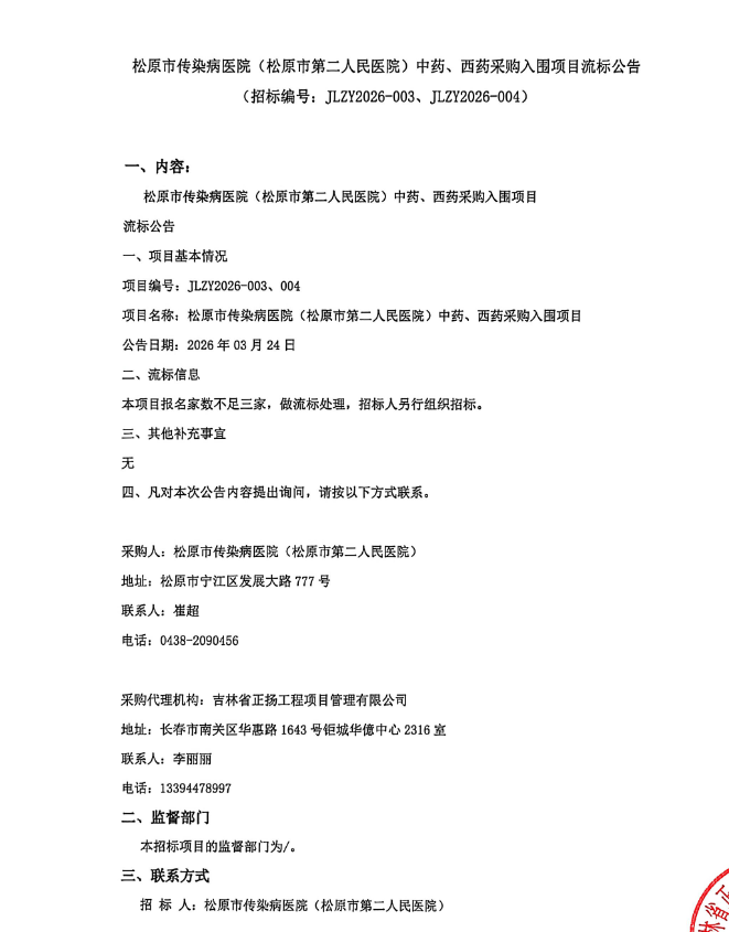吉林省松原市传染病医院(松原市第二人民医院)中药、西药采购入围项目流标公告