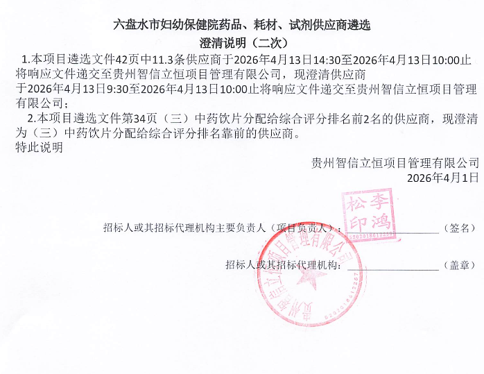 贵州省六盘水市妇幼保健院药品、耗材、试剂供应商遴选澄清说明(二次)