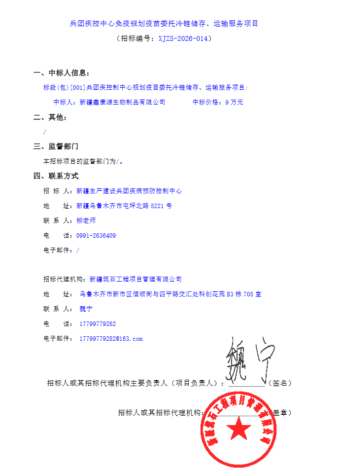 新疆生产建设兵团疾控中心免疫规划疫苗委托冷链储存、运输服务项目中标