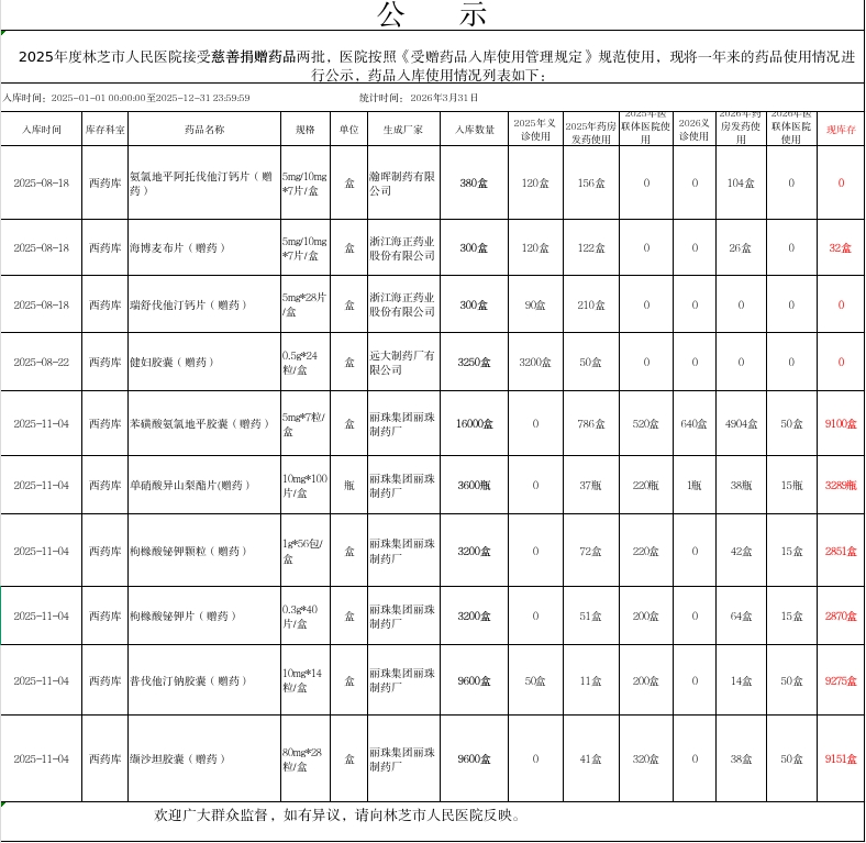 西藏自治区林芝市人民医院2025年度慈善捐赠药品使用情况公示