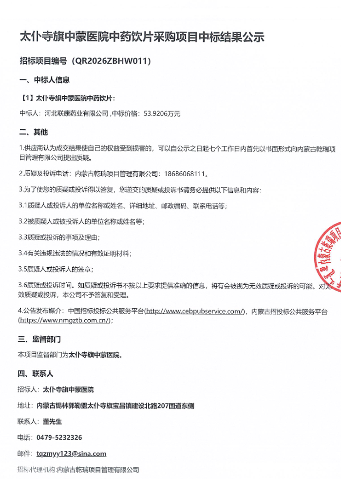 内蒙古自治区锡林郭勒盟太仆寺旗中蒙医院中药饮片采购项目中标结果公示