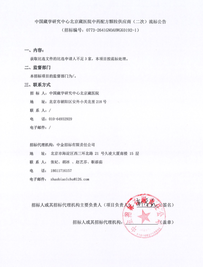 中国藏学研究中心北京藏医院中药配方颗粒供应商(二次)流标公告