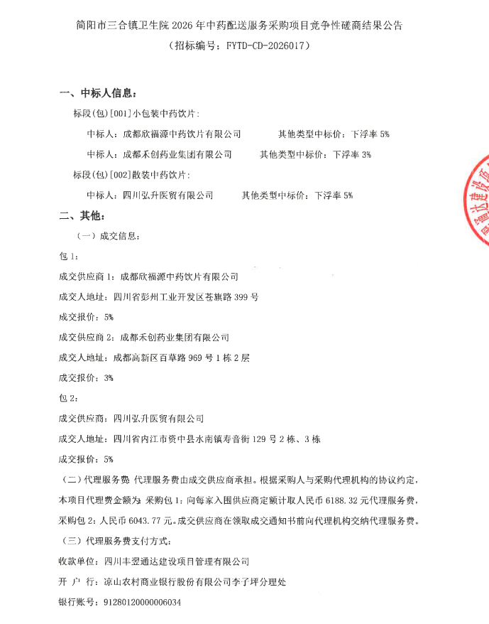 四川省简阳市三合镇卫生院2026年中药配送服务采购项目竞争性磋商结果公告