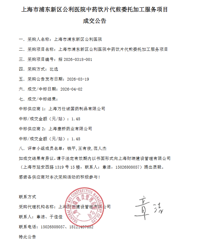 上海市浦东新区公利医院中药饮片代煎委托加工服务项目成交公告
