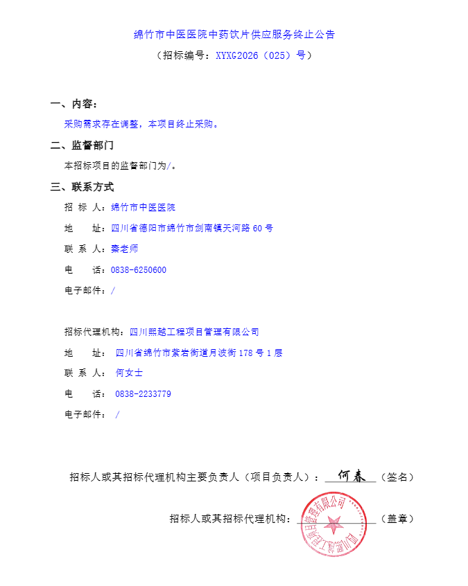 四川省绵竹市中医医院中药饮片供应服务终止公告