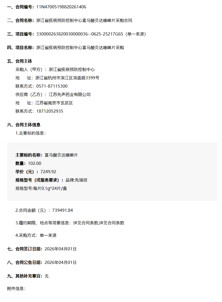 浙江省疾病预防控制中心富马酸贝达喹啉片采购合同公告