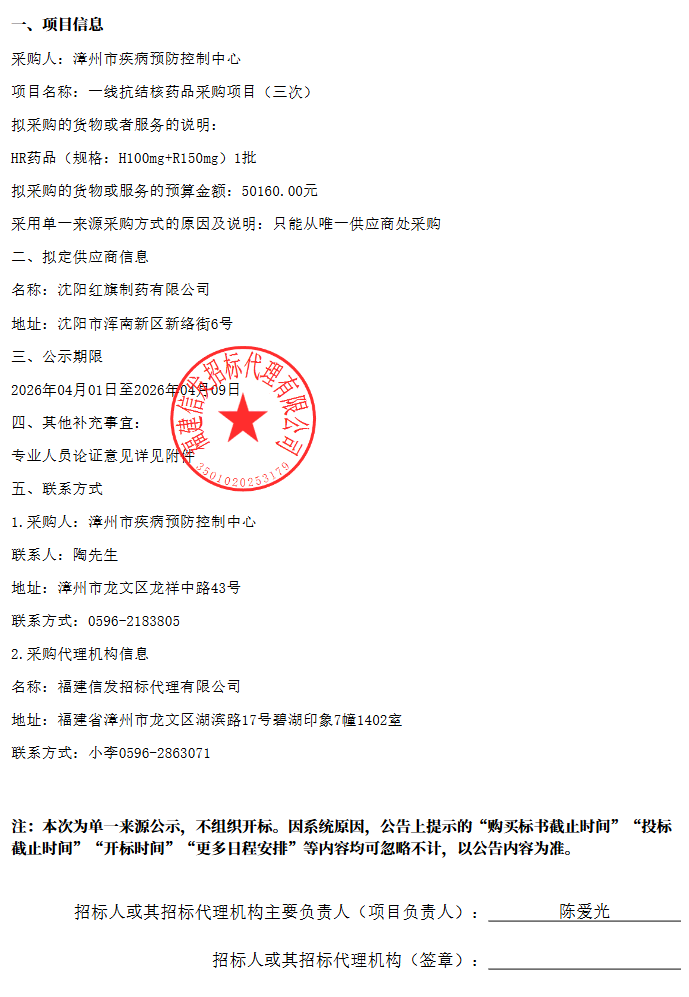 福建省漳州市疾病预防控制中心一线抗结核药品采购项目(三次)采购实行单一来源采购方式的公示