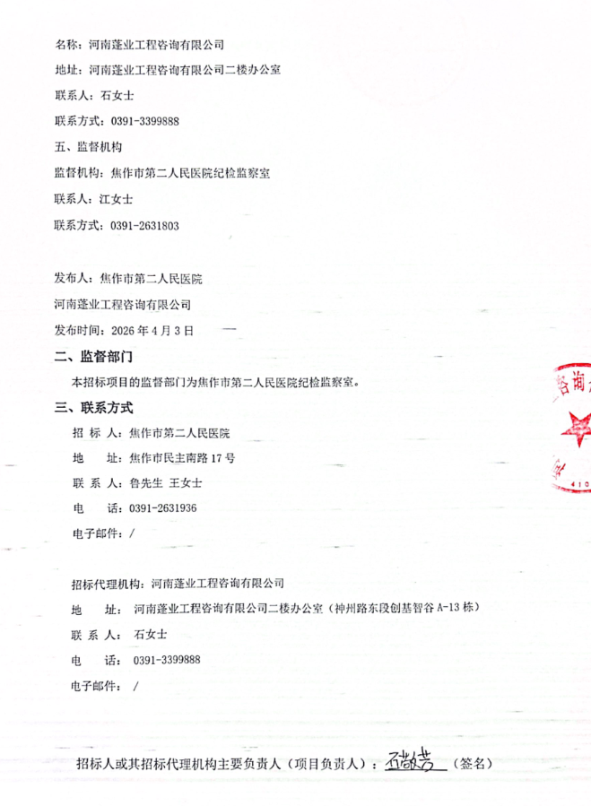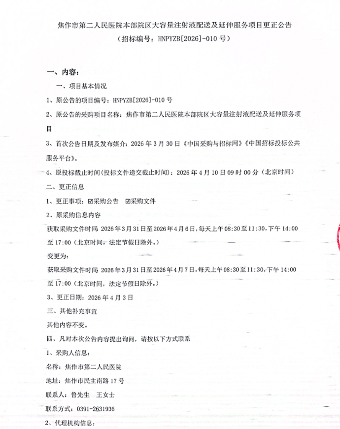 河南省焦作市第二人民医院本部院区大容量注射液配送及延伸服务项目更正公告