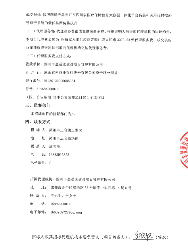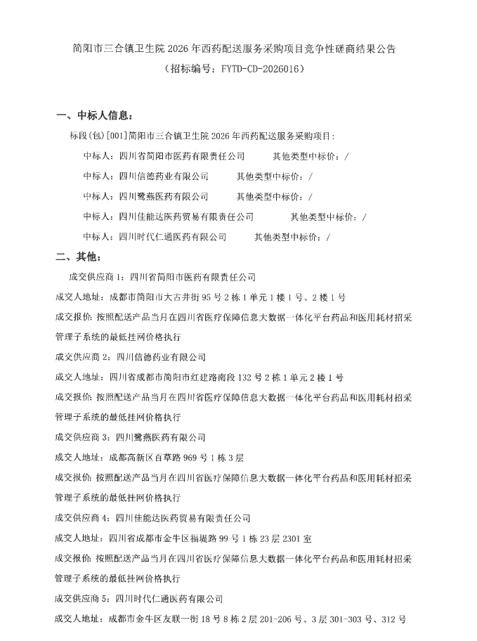 四川省简阳市三合镇卫生院2026年西药配送服务采购项目竞争性磋商结果公告