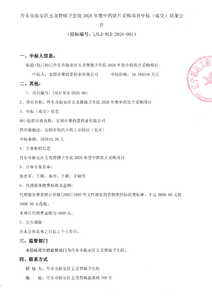 辽宁省丹东市振安区五龙背镇卫生院2026年度中药饮片采购项目中标(成交)结果公告