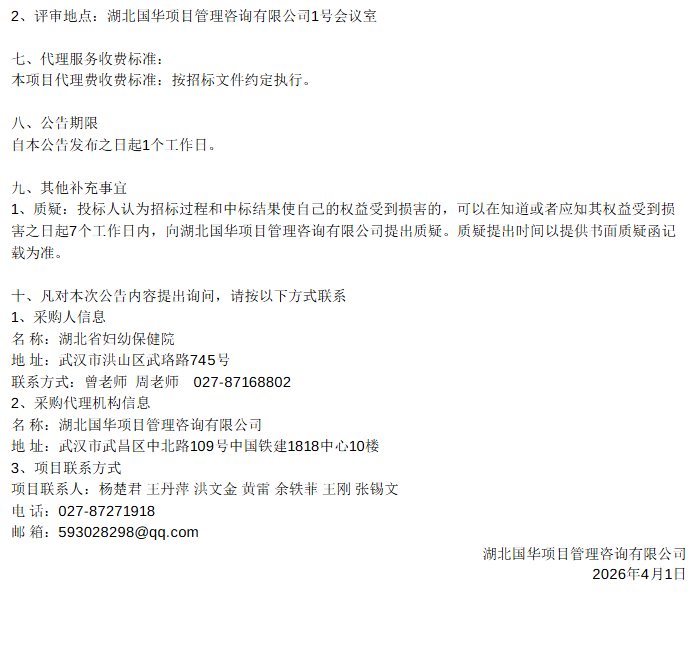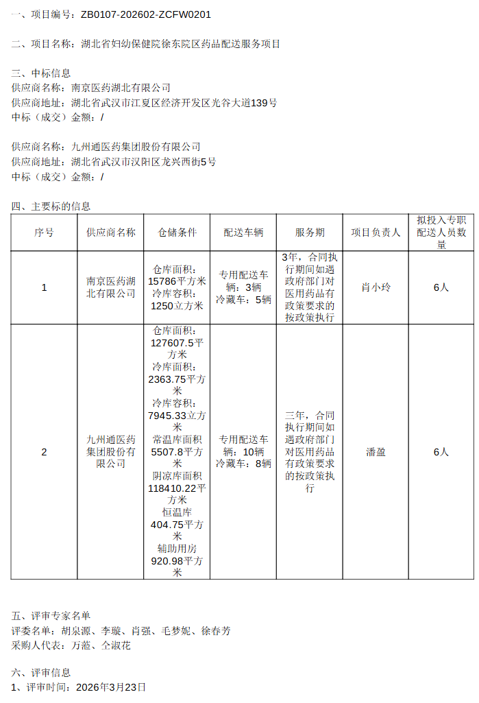 湖北省妇幼保健院徐东院区药品配送服务项目中标公告