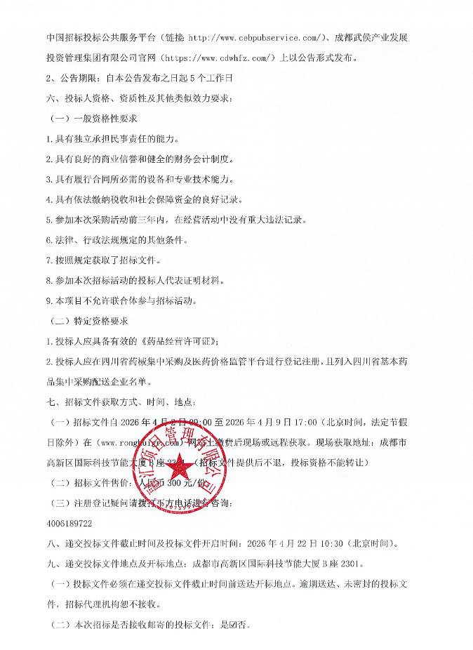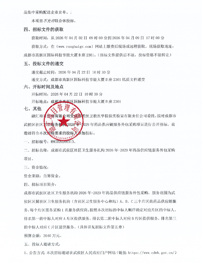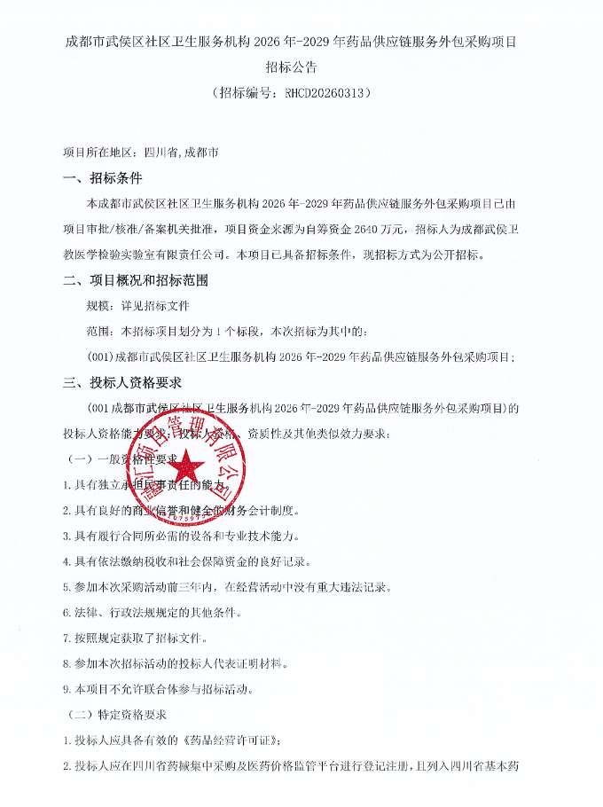 四川省成都市武侯区社区卫生服务机构2026年-2029年药品供应链服务外包采购项目招标公告